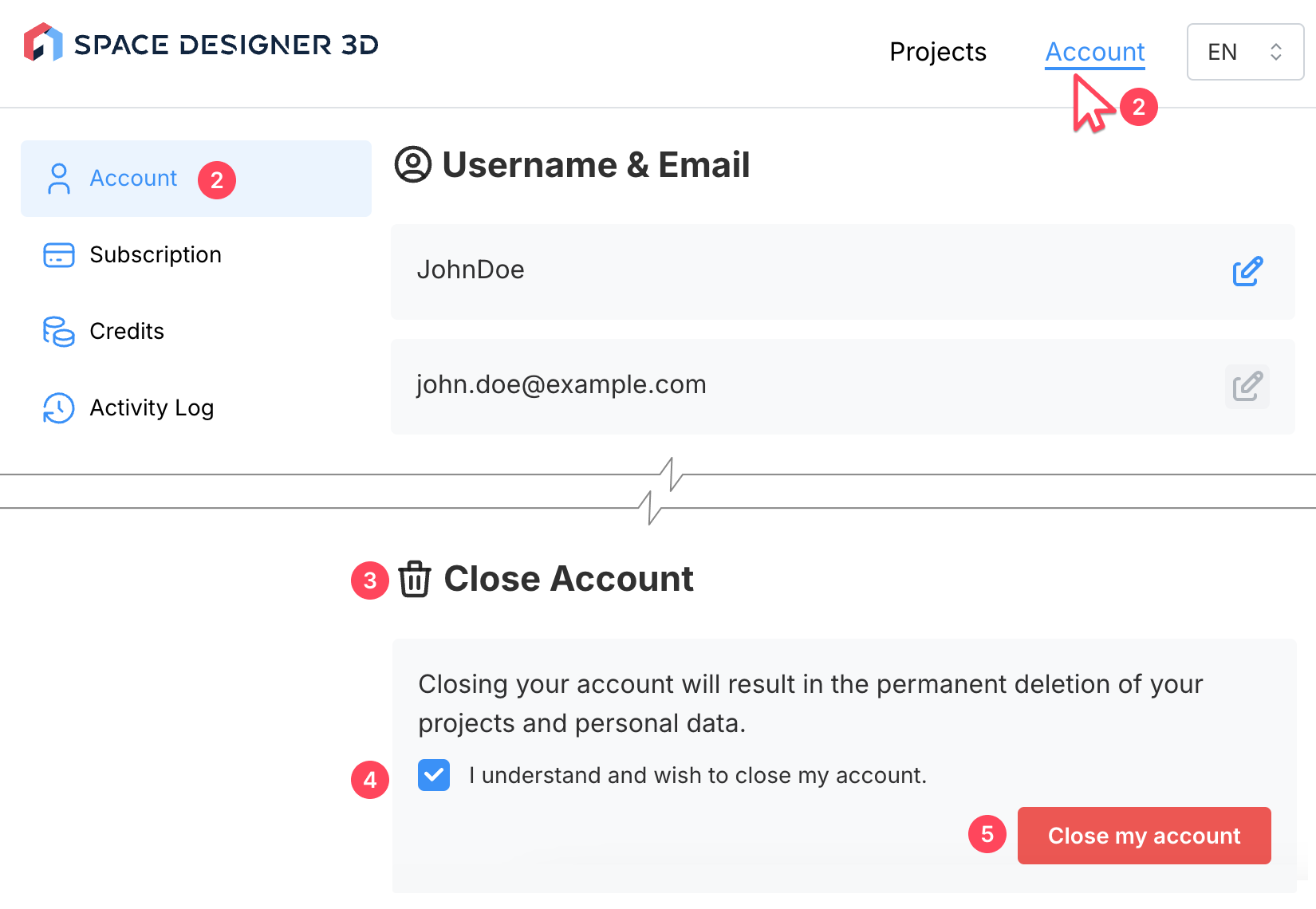 If you experienced any issues while deleting your account, or if you’d like to confirm that the operation was completed successfully, feel free to contact our support team at support@spacedesigner3d.com. We're here to help!