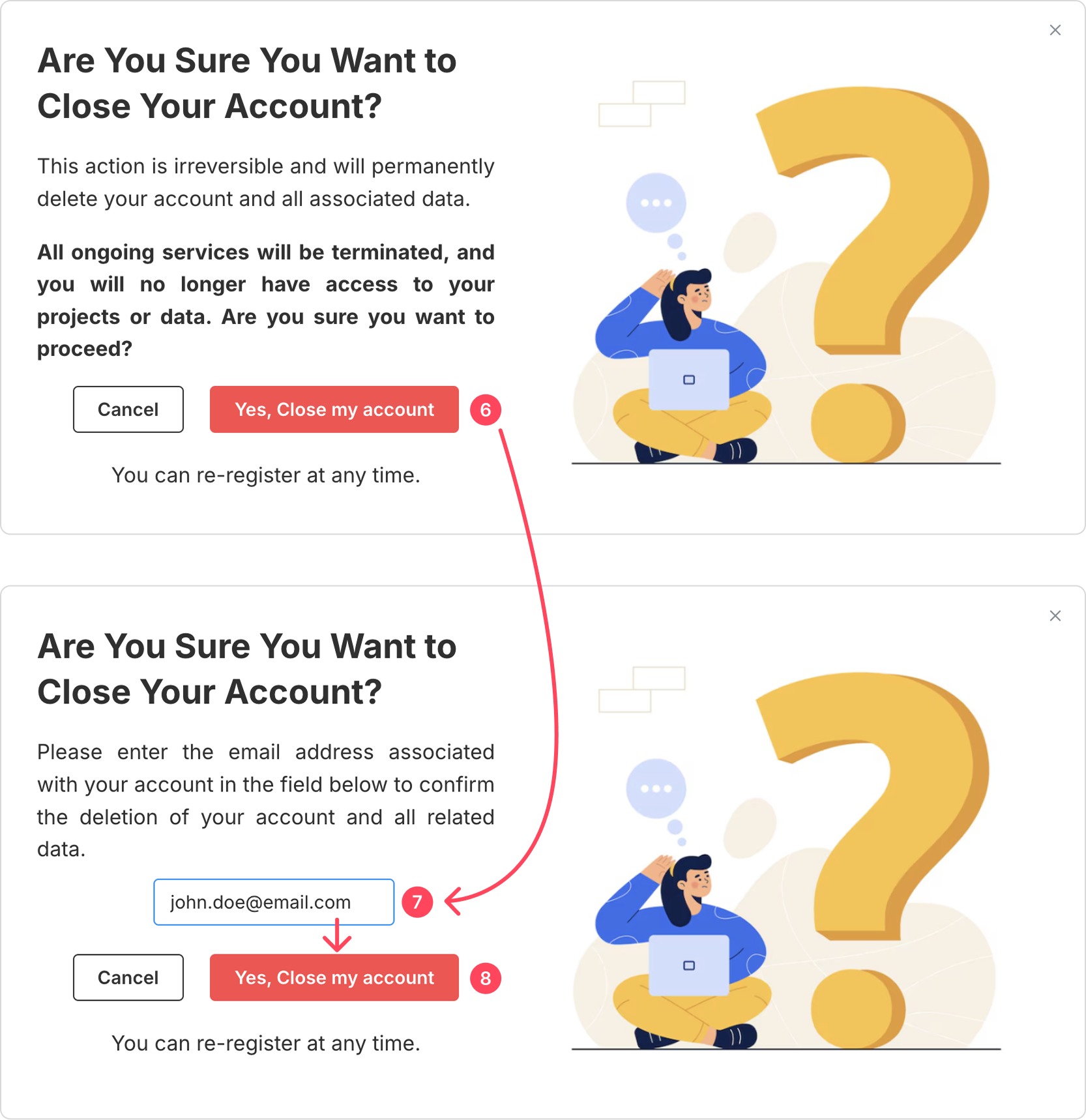 ⚠️ Note: The capitalization used when you created your account must be respected. The email address must exactly match the one registered. - Click Yes, Close my account to finalize the deletion.