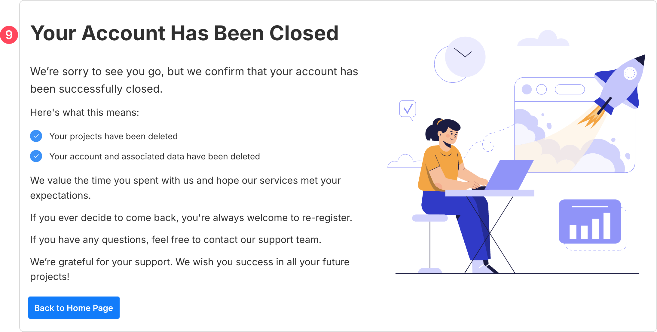 The confirmation page will appear to confirm that your account has been successfully closed.