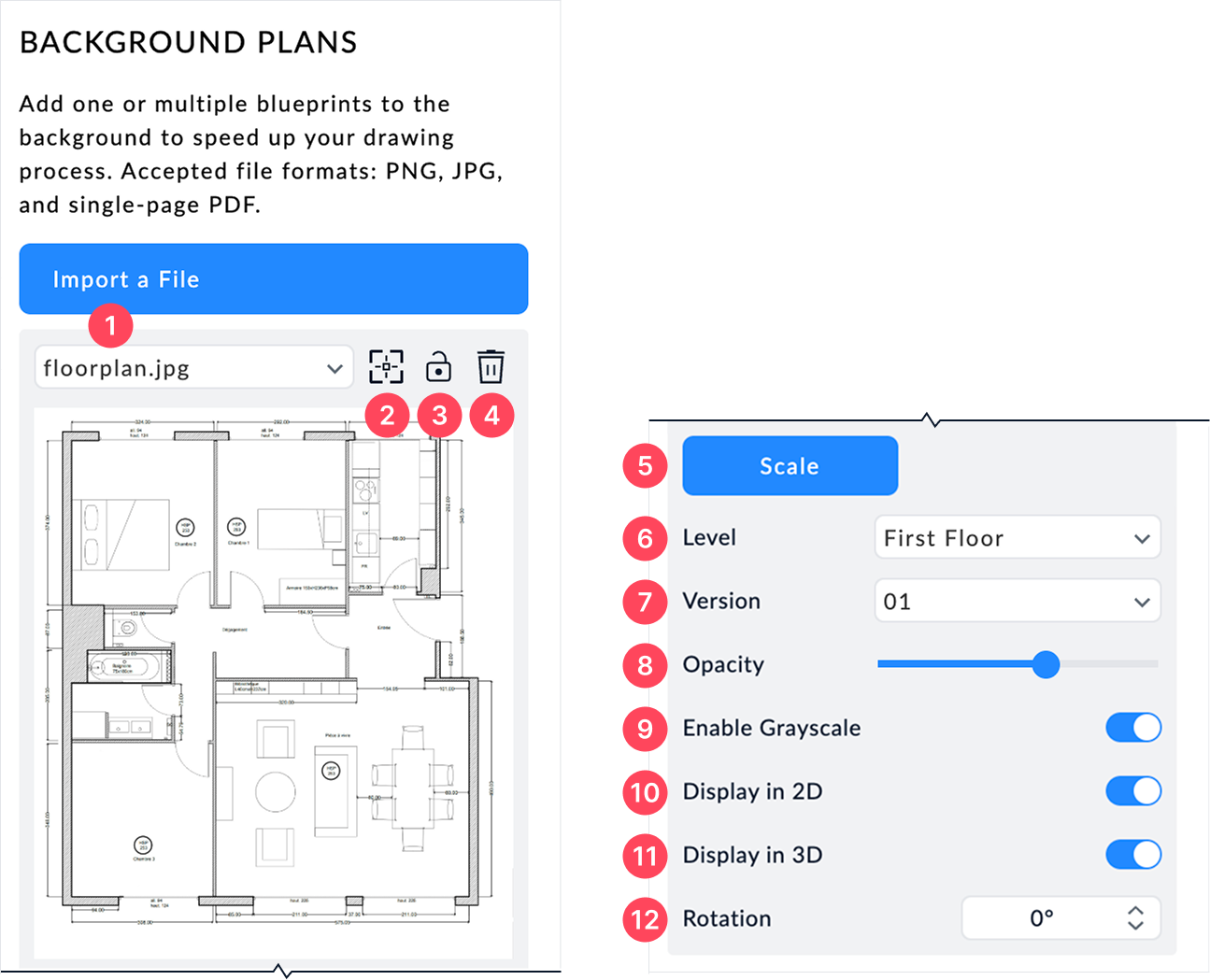 If you have imported multiple plans, select one using the dropdown menu. This lets you assign each file to a different level (floor, basement, etc.).