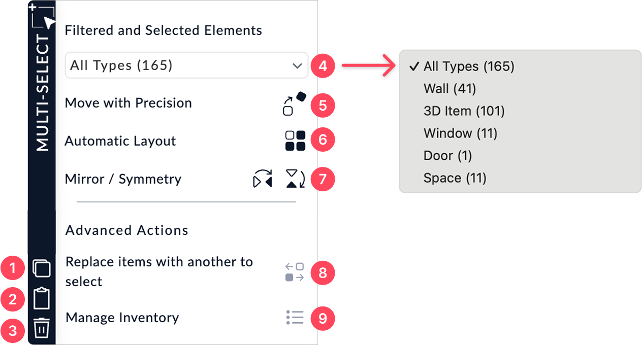 - Wall, 3D Item, Window, Door, Space, etc. : allows you to act on a specific type of object