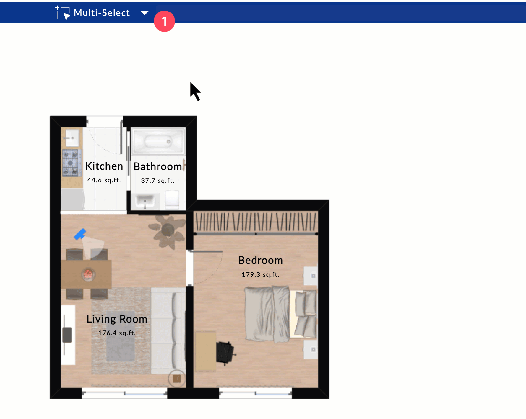 The Multi-Select tool allows you to select several objects (furniture, walls, windows, annotations, etc.) in one single action. It is accessible from the toolbar at the top of the screen.