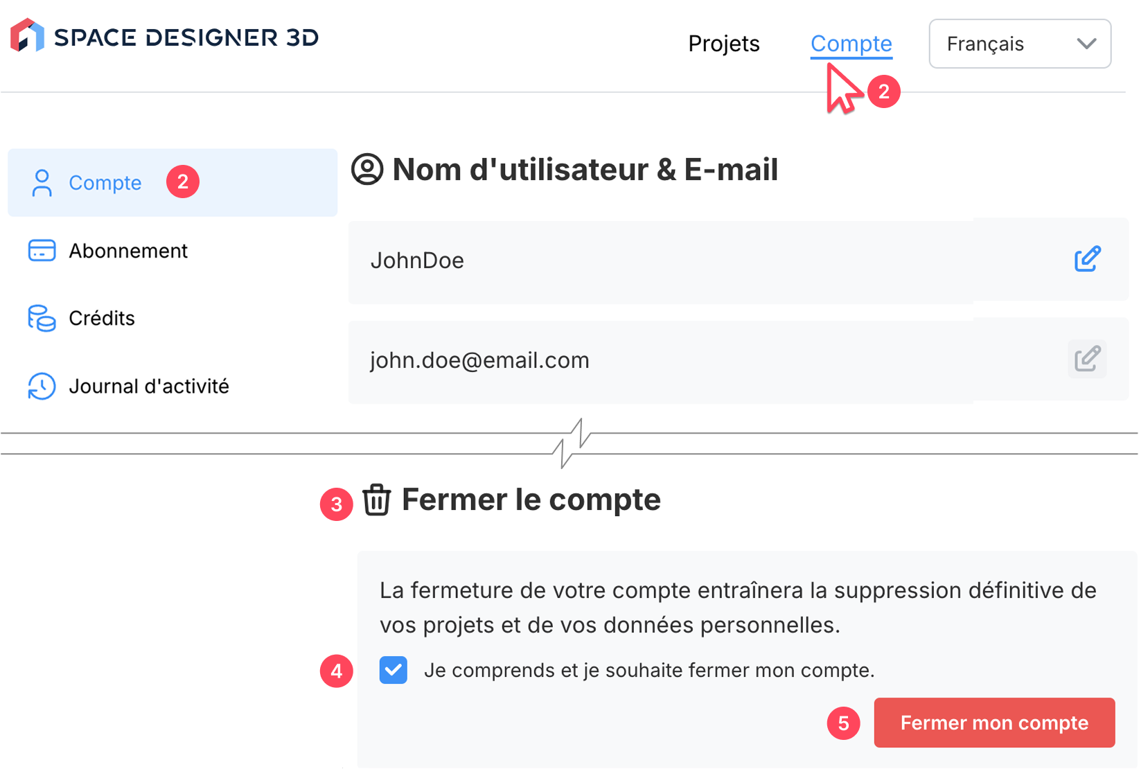 Si vous avez rencontré un problème lors de la suppression de votre compte, ou si vous souhaitez simplement confirmer que l’opération a bien été effectuée, vous pouvez contacter notre service support à l’adresse support@spacedesigner3d.com. Nous sommes là pour vous aider!