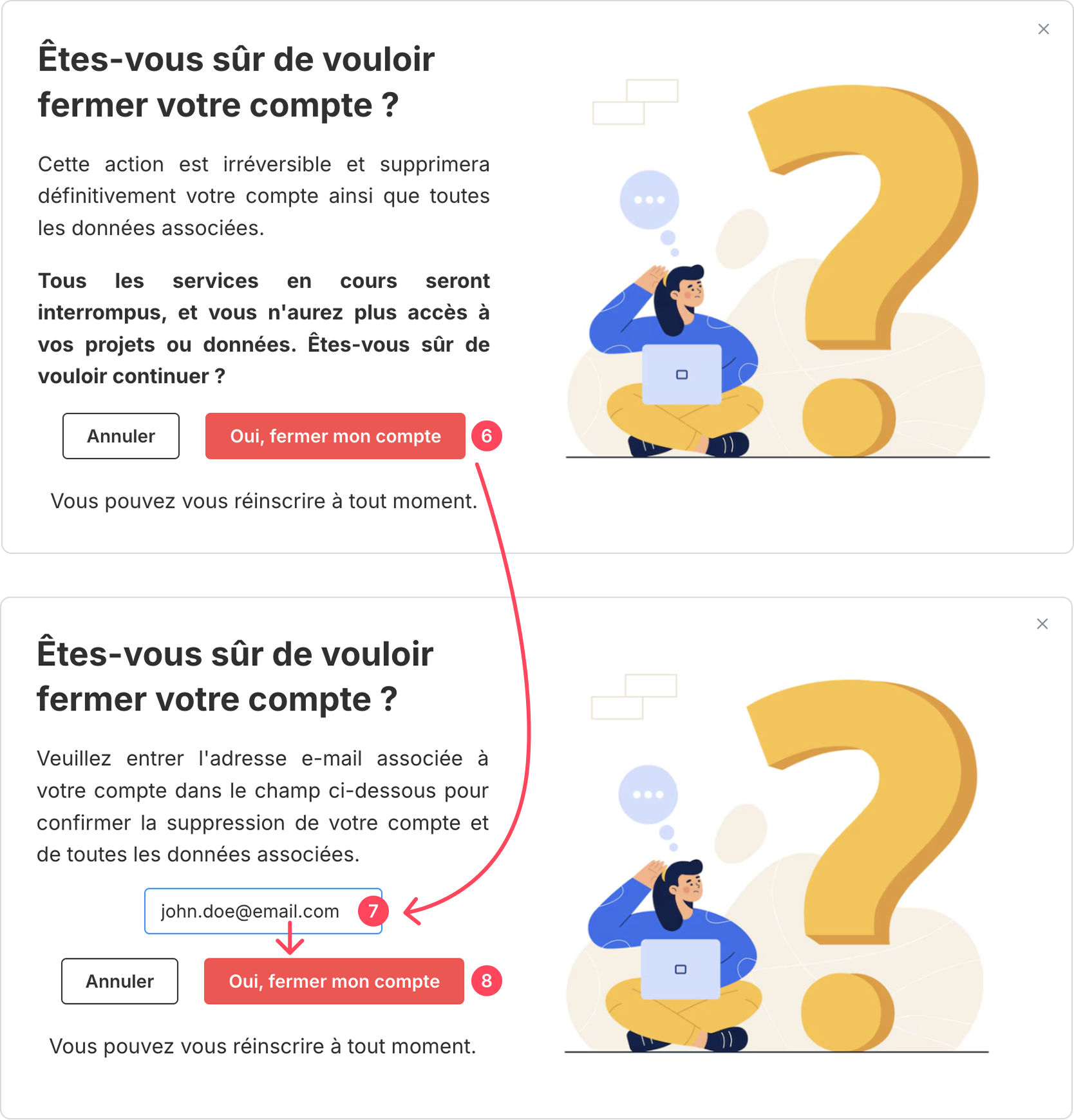 - Saisissez l’adresse e-mail associée à votre compte dans le champ prévu. Cette confirmation par e-mail sert à sécuriser l’opération et éviter les erreurs accidentelles.