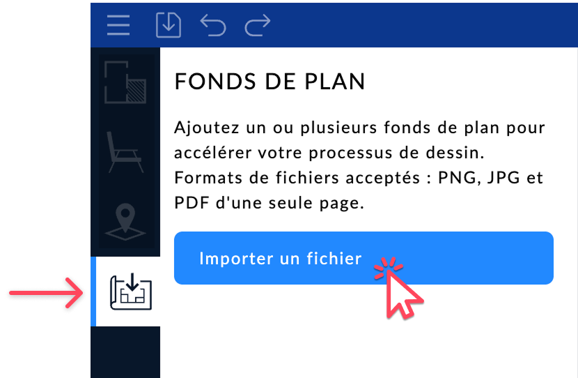 Ajoutez un plan existant en arrière-plan pour tracer plus facilement les murs, portes, fenêtres et aménager l'espace. Vous pouvez calibrer l’échelle pour que les dimensions correspondent à la réalité.