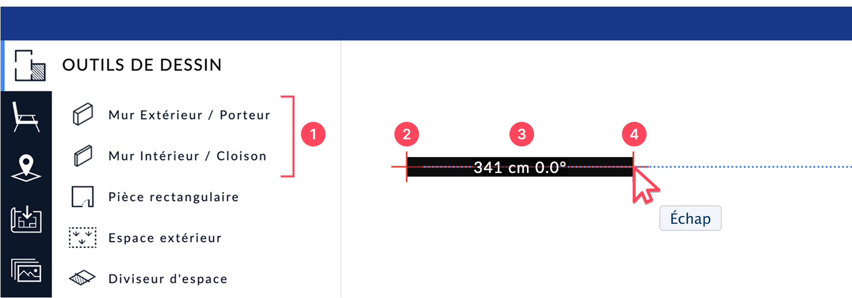 - Tracer un mur : Cliquez sur un point de départ dans la zone de dessin, puis déplacez la souris pour dessiner le mur. Un guide d'orthogonalité en pointillés bleus apparaîtra automatiquement pour vous guider.