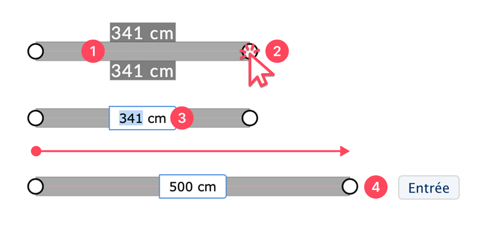 - Ajuster la longueur : La longueur du mur est affichée en temps réel. Vous pouvez ensuite entrer une valeur précise en utilisant le clavier (voir ci-après Ajuster la longueur d’un mur).