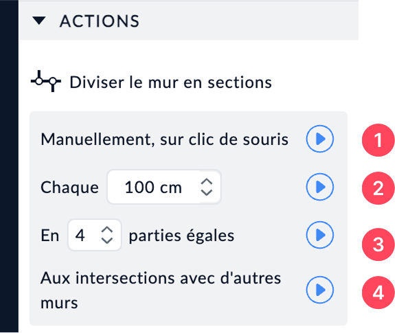 - Diviser le mur manuellement : Permet de diviser un mur en cliquant directement à l'emplacement souhaité.