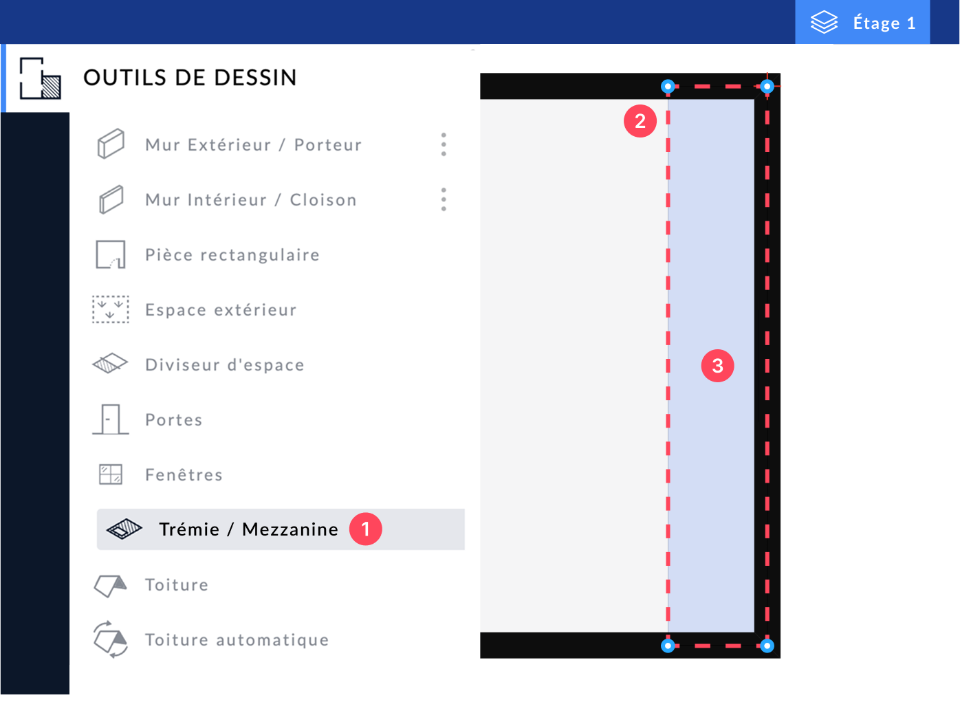- Sélectionnez l’outil Trémie / Mezzanine dans la barre latérale des outils de dessin.