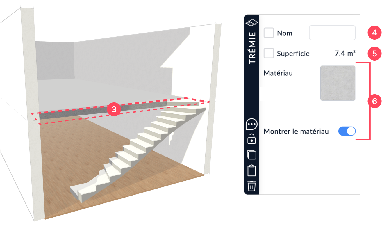 Pour aider à positionner l'ouverture avec précision, affichez les niveaux inférieurs en utilisant l'icône 👁 dans le sélecteur de niveaux. - Ajouter des escaliers, des garde-corps ou des meubles