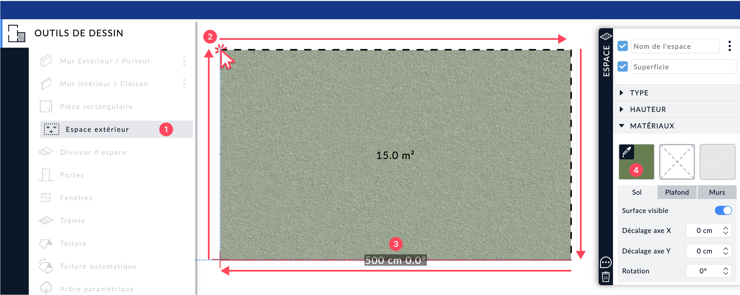 Pour représenter un jardin, une cour ou tout autre espace extérieur, commencez par dessiner une surface dédiée à l'extérieur du bâtiment.