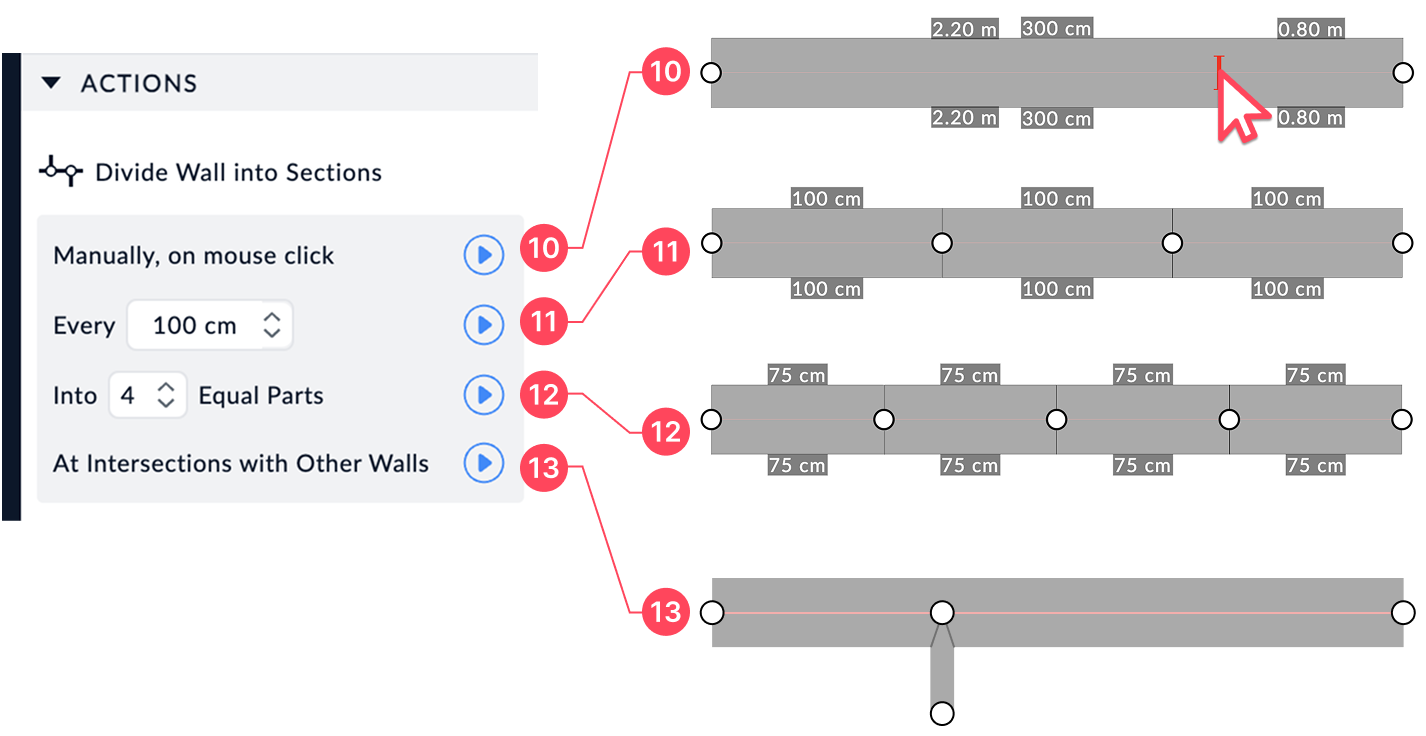 Allows you to divide a wall by clicking directly at the desired point.