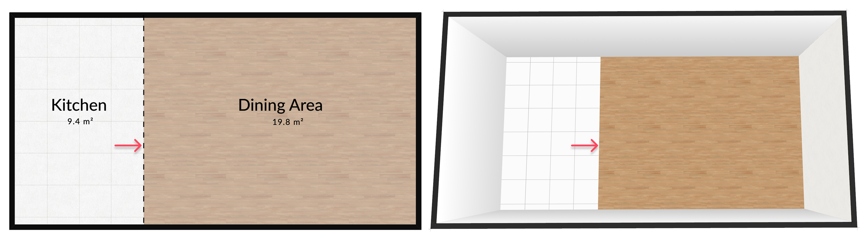 This feature is useful for separating the surface area of two spaces without a physical partition, while still allowing for different flooring materials. For example, it can be used to visually distinguish an open kitchen from a dining area: