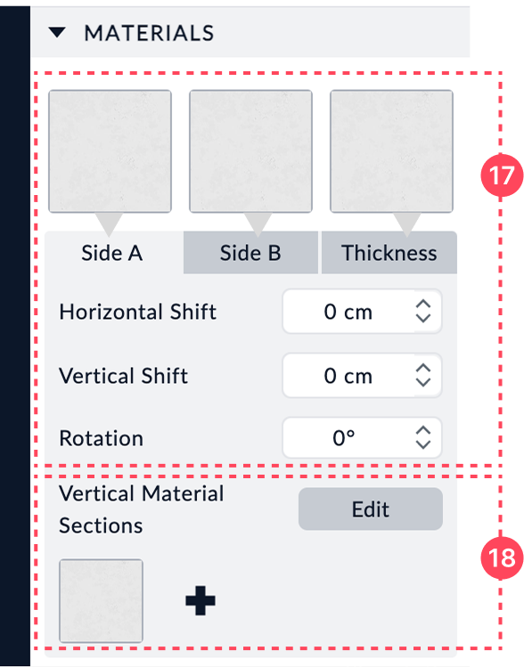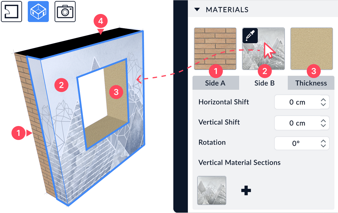 In addition to these main surfaces, you can apply specific materials to vertical sections of the wall using the Vertical Material Sections option.
