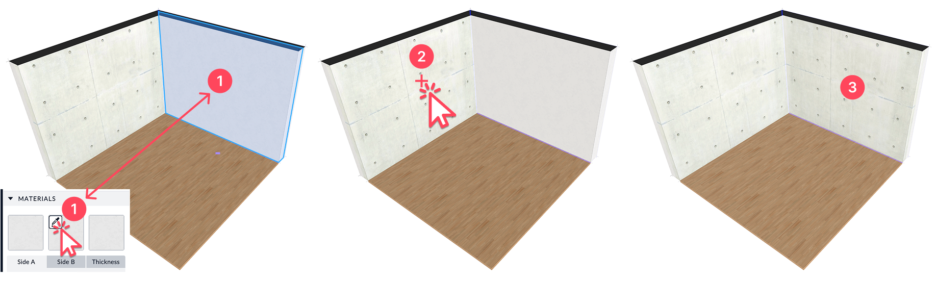 This option is particularly helpful if you want to apply different materials to the outer sides of walls between adjacent rooms.