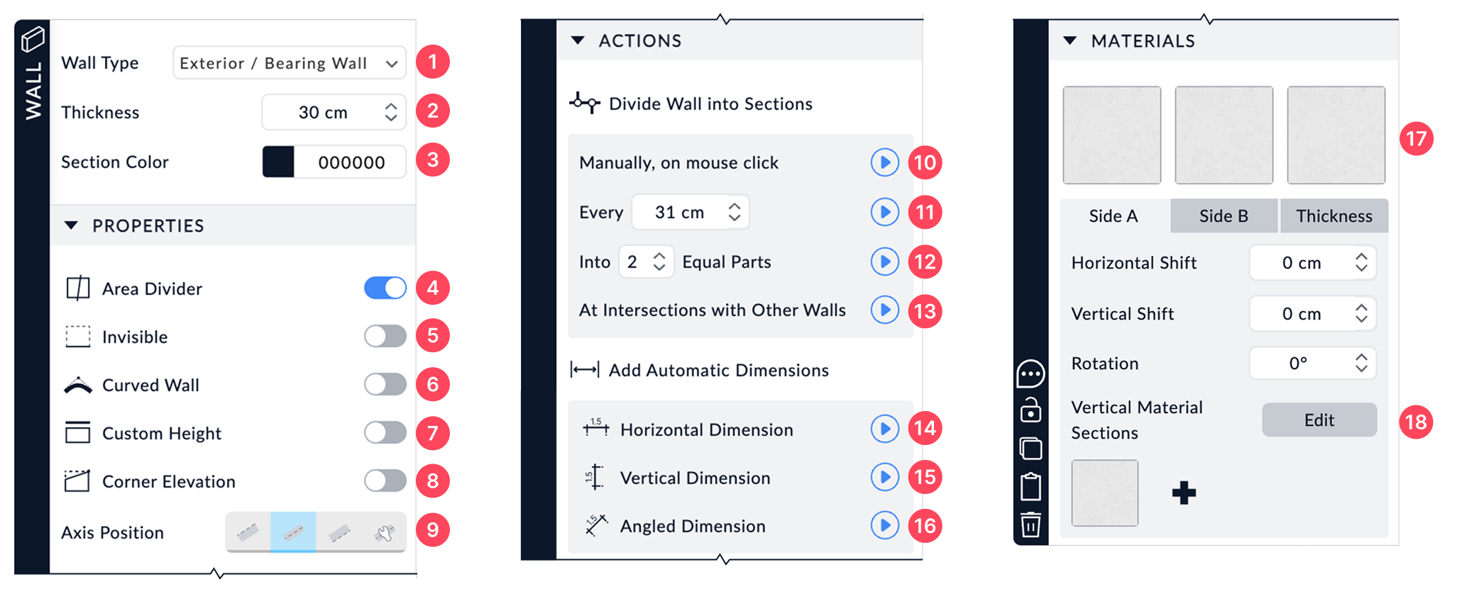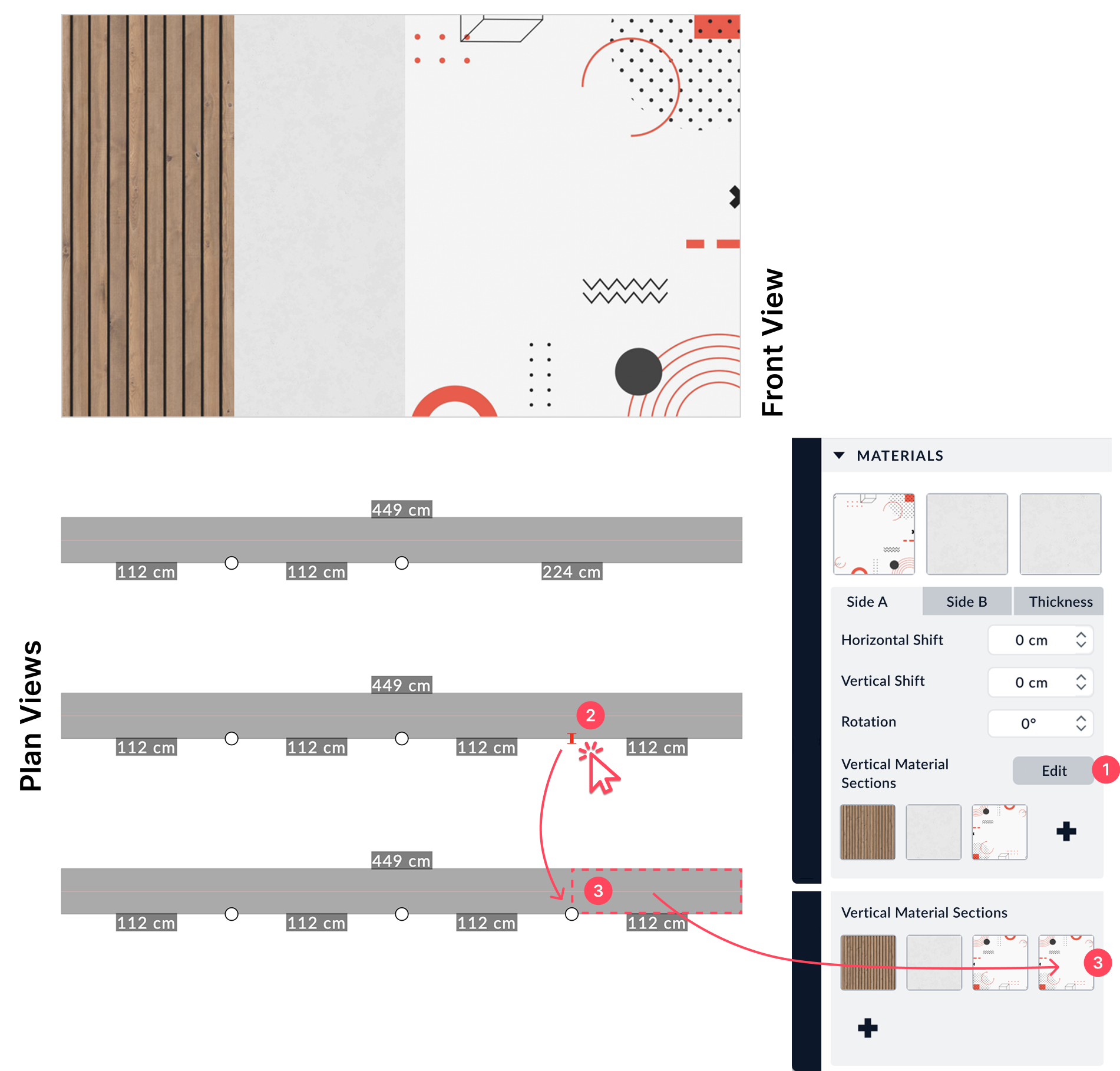 This feature allows you to apply multiple materials to the same wall without splitting it. You can divide a wall into distinct vertical sections and assign each one a different finish.