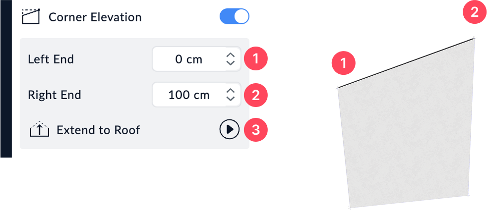 The Corner Elevation option allows you to adjust the height of each end of a wall to create a slope. This feature is especially useful for walls located under a sloped roof.