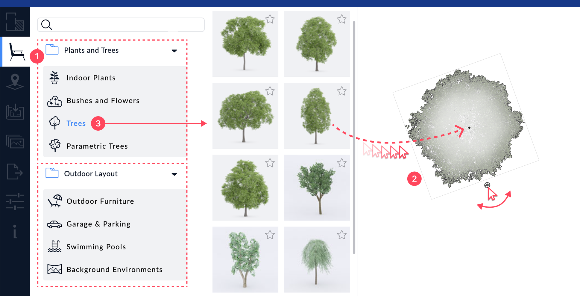 Drag and drop objects from the catalog into your 2D or 3D scene. Position them freely based on your layout. - Prefer static trees for better performance